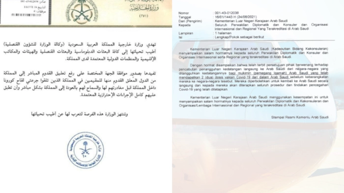 Hal ini tertuang dalam nota Kemenlu Saudi bernomor 001-43-012038, tanggal 16/01/1443 H (24/08/2021), yang ditujukan kepada Seluruh Perwakilan Diplomatik, Konsuler dan Organisasi Internasional dan Regional yang terakreditasi di Arab Saudi.
