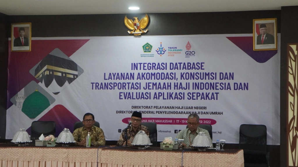 Makassar (PHU) —- Direktur Pelayanan Haji Luar Negeri Ditjen PHU Subhan Cholid secara resmi membuka acara Integrasi Database Layanan Konsumsi dan Transportasi Haji Indonesia dan Evaluasi Aplikasi Sepakat di UPT Asrama Haji Embarkasi Makassar pada Kamis (17/11/2022).