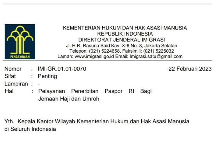 HIMPUHNEWS - Dirjen Imigrasi Kementerian Hukum dan Ham (Kemenkumham), Silmy Karim telah menerbitkan Surat Resmi Nomor IMI-GR.01.01-0070 tentang Pelayanan Penerbitan Paspor RI bagi Jemaah Haji dan Umrah.